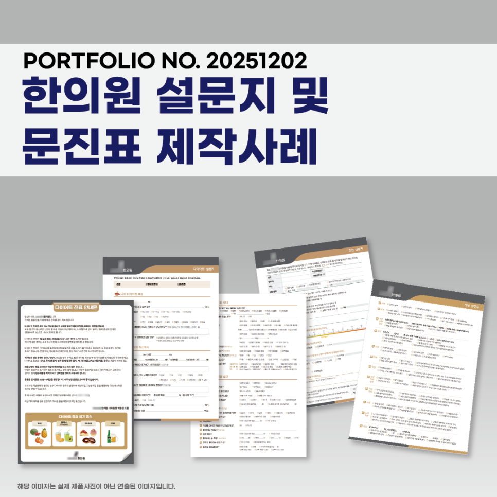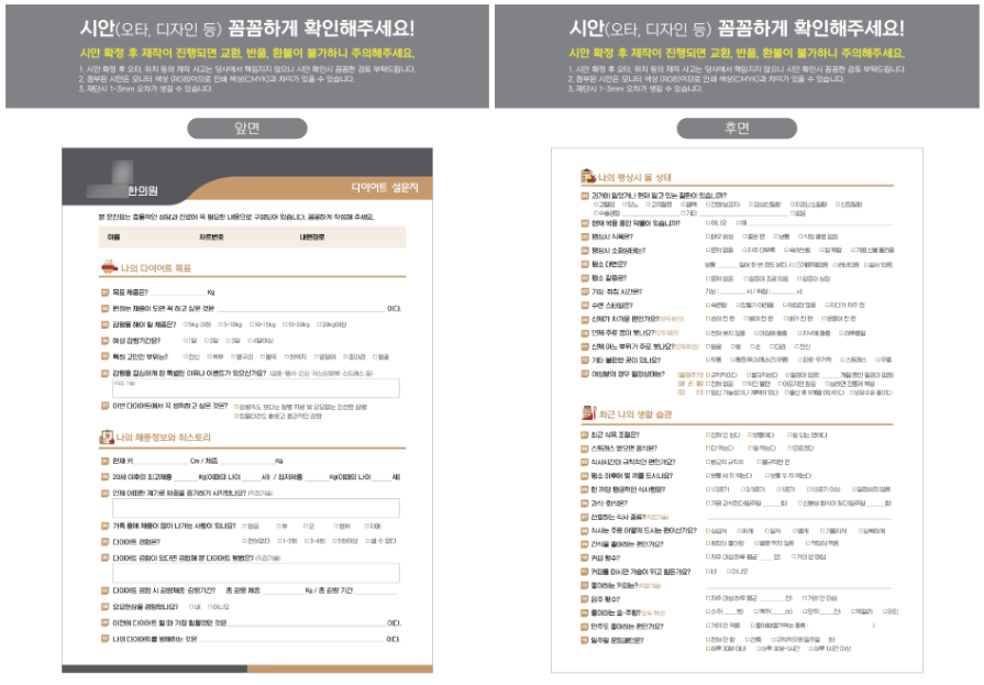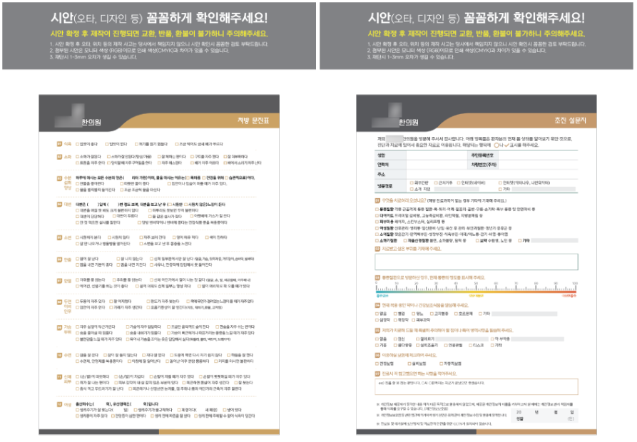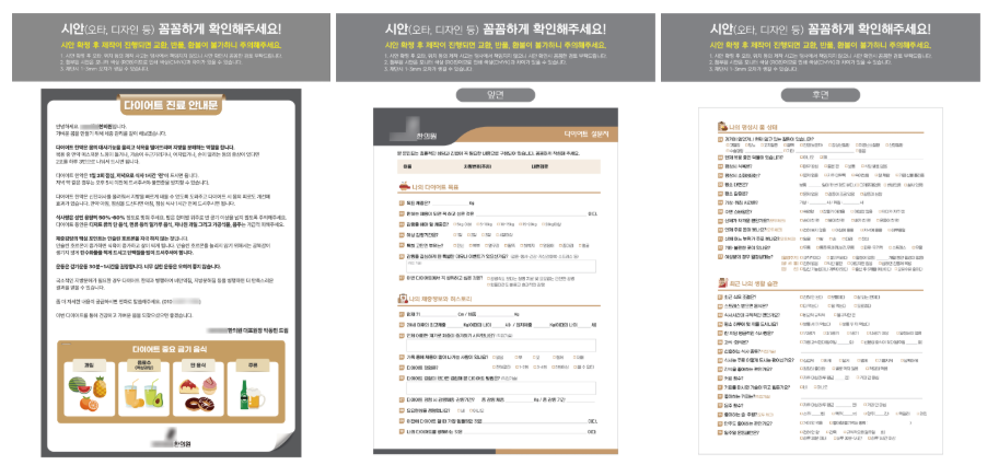 다이어트설문지와 초진설문지, 초진문진표는 기존 디자인을 토대로 고객님께서 전달해 주신 수정사항을 적용하여 작업하였습니다.