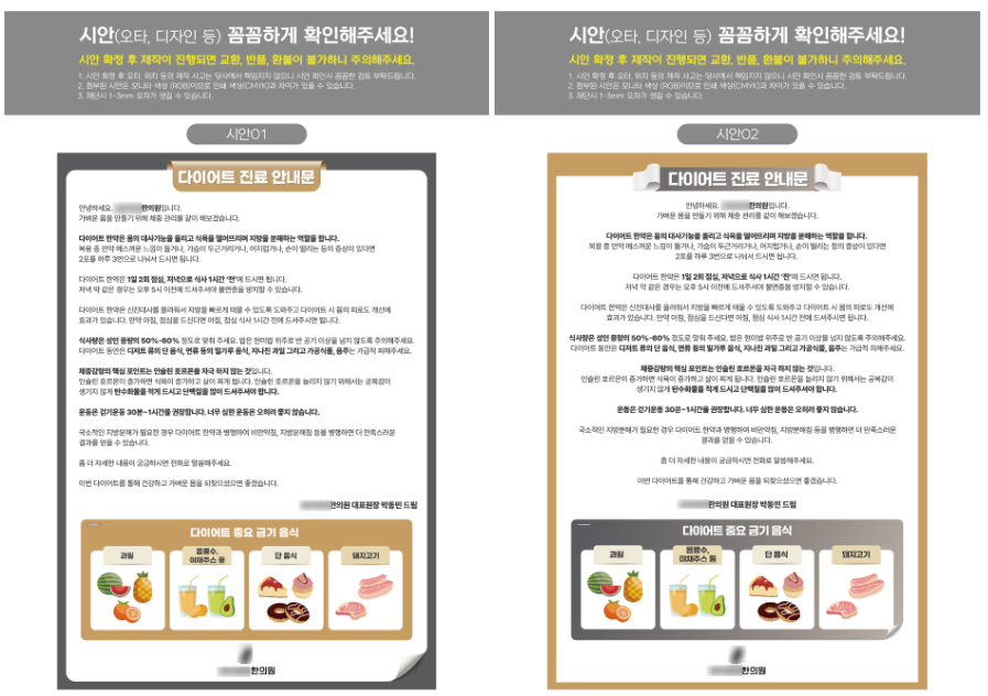 시안을 확인하신 고객님께서는 맞춤디자인으로 진행하신 다이어트 진료안내문은 어두운 컬러로 선택해 주셨고,